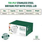 Triply Stainless Steel Stock Pot Or Biryani Pot Or Casserole With Steel Lid | Medium 21.6cm, 8.5 Inch, 3 Liters, 1.4 Kg - Induction Friendly, Nonstick 3-Layer Body, 100% Pure & Toxin-Free