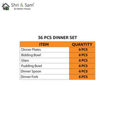 Stainless Steel Shagun Solid Dinner Set Of 36 Pcs, Silver | 6 Dinner Plates+ 6 Bidding Bowls+ 6 Pudding Bowls+ 6 Glasses+ 6 Dinner Spoons+ 6 Dinner Forks Premium Quality Stainless Steel: Our dinner set is made from high-quality stainless steel, known for its...- $162.92 USD