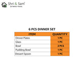 Stainless Steel Delight Solid Dinner Set Of 6 Pieces, Silver | 1 Dinner Plate+ 1 Glass+ 2 Bowls+ 1 Pudding Bowl+ 1 Dessert Spoon
