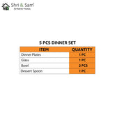 Stainless Steel Delight Solid Dinner Set Of 5 Pieces, Silver | 1 Dinner Plate+ 1 Glass+ 2 Bowls+ 1 Dessert Spoon - Easy To Clean & Dishwasher Safe