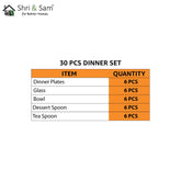Stainless Steel Delight Dinner Set Of 30 Pieces, Silver | 6 Dinner Plates+ 6 Glasses+ 6 Bowls+ 6 Dessert Spoons+ 6 Tea Spoons