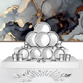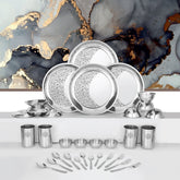 Designer Stainless Steel Shagun Laser Bloom Dinner Set Of 36 Pieces, Silver | 6 Dinner Plate+ 6 Glass+ 6 Bidding Bowl+ 6 Pudding Bowl+ 6 Dinner Spoon+ 6 Dinner Fork Dinner Plate - 06 N, Glass - 06 N, Bidding Bowl - 06 N,...- $175.08 USD