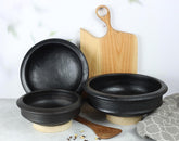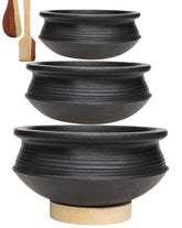 Deep Burned Uncoated Clay Pot Or Mitti Handi Combo With 2 Wooden Spatulas Complimentary Pack Of 3 - Black, 1+2+3 Liters | Pre-Seasoned Mud Pot - Unglazed, Double Fired, Hand Crafted