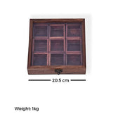 Sheesham Wood Spice Box With Spoon For Kitchen With 9 Partitions, Compartments - 8 X 8 X 2 Inches, Brown | Wooden Masala Box, Dabba, Container With Glass Lid - Fixed Partitions