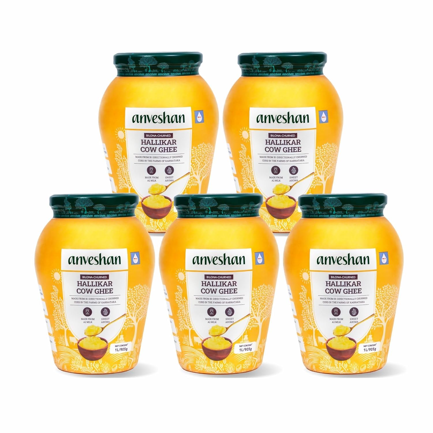 100% Natural Bilona-Churned Hallikar Cow Ghee By Anveshan | High In Vitamins A, D & Healthy Bilona Method Desi Ghee For Skin Care | 5 Litr (1 Litr * 5) 169.0 Ounce | Jar Pack