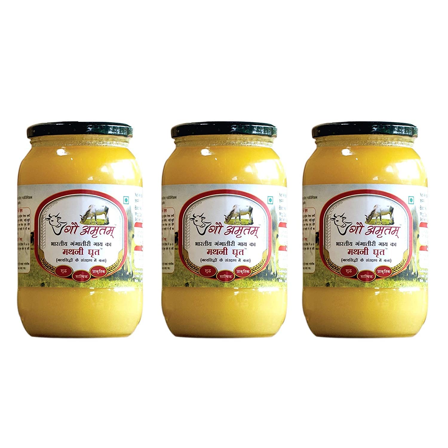 100% Natural Vedic Mathni Ghrit Desi Ghee By Gau Amritam | Pure Healthy Traditional Curd Churned Desi Cow Ghee For Laddus | 1.5 Litre (500ml * 3) 50.7 Ounce | Jar Pack