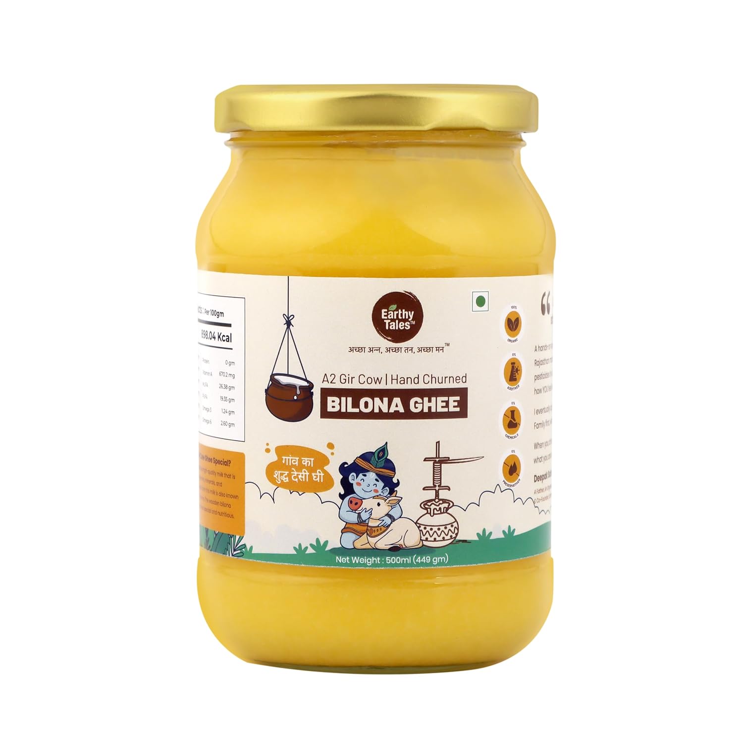 100% Pure A2 Gir Cow Ghee By Earthy Tales | Bilona Method Hand Churned Grass Feed Gir Cow Desi Ghee Perfect For Roast Makhana | (500ml) 16.9 Ounce | Jar Pack