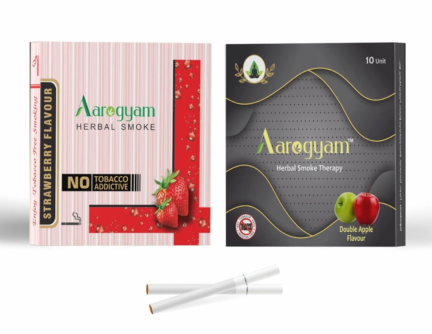 Aarogyam Herbals Pack Of 2 Flavours 100% Tobacco & Nicotine Free Cigarette For Relieve Stress & Mood Enhance Product Double Apple - Strawberry - 10 Sticks X 2 Packets