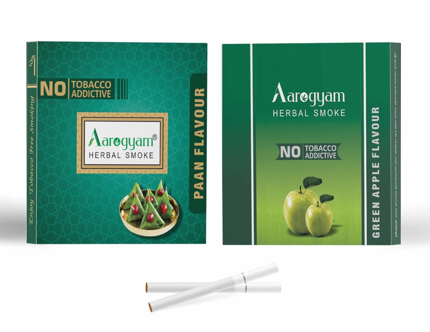 Aarogyam Herbals Pack Of 2 Flavours 100% Tobacco & Nicotine Free Cigarette For Relieve Stress & Mood Enhance Product Green Apple , Paan - 10 Sticks X 2 Packets