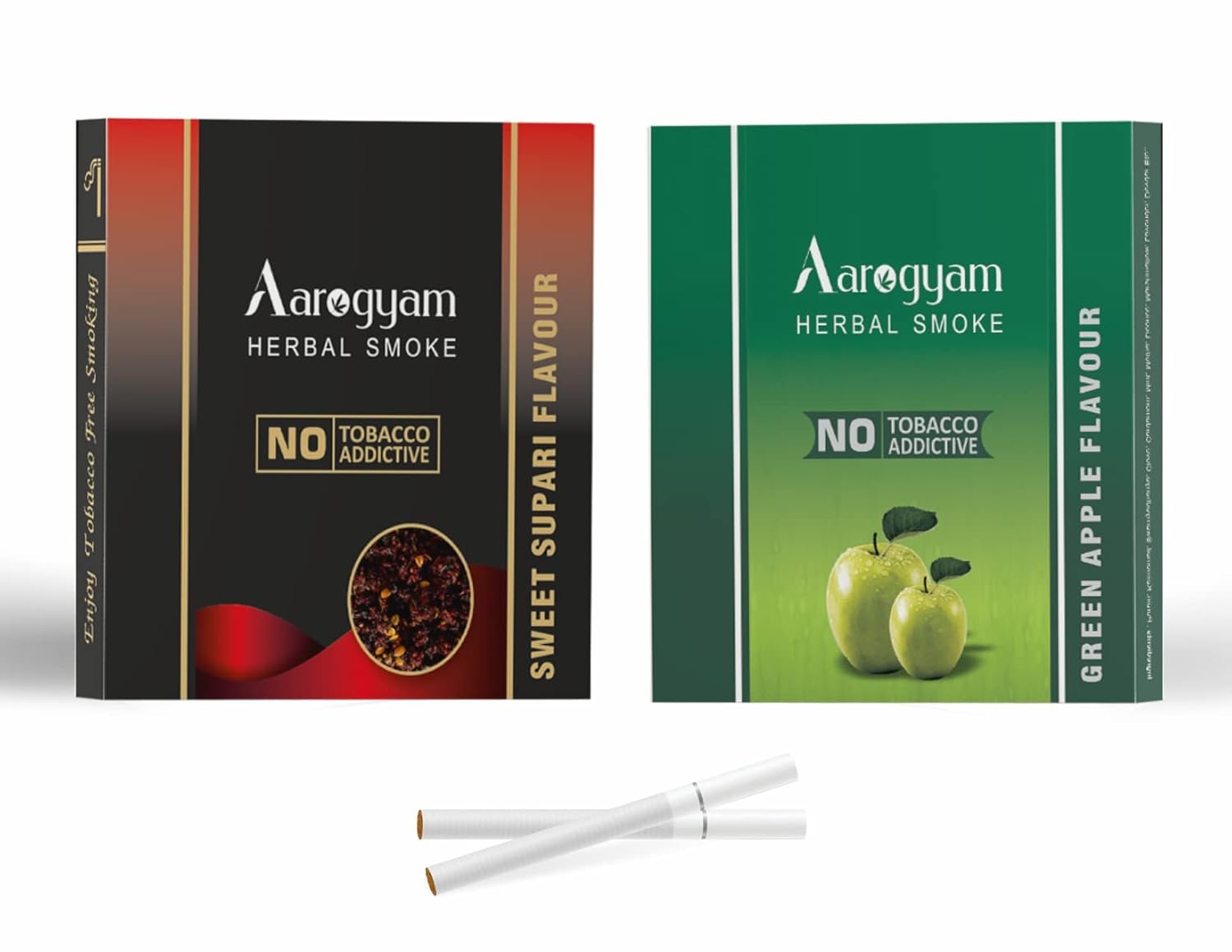 Aarogyam Herbals Pack Of 2 Flavours 100% Tobacco & Nicotine Free Cigarette For Relieve Stress & Mood Enhance Product Green Apple, Sweet Supari - 10 Sticks X 2 Packets