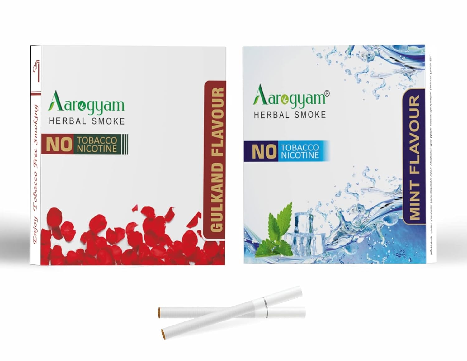 Aarogyam Herbals Pack Of 2 Flavours 100% Tobacco & Nicotine Free Cigarette For Relieve Stress & Mood Enhance Product Mint, Gulkand - 10 Sticks X 2 Packets