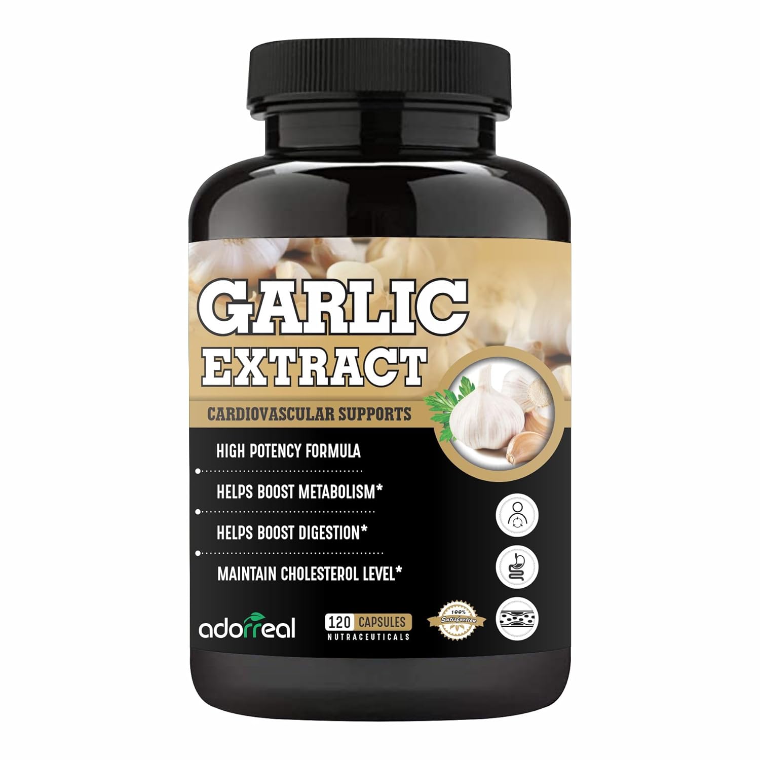 Adorreal Garlic Extract Capsules, Cardiovascular Support, Boosts Digestion, Maintains Cholesterol, Promoting Healthy Blood Flow & Circulation | 120 Capsules 150gm 0.3lbs
