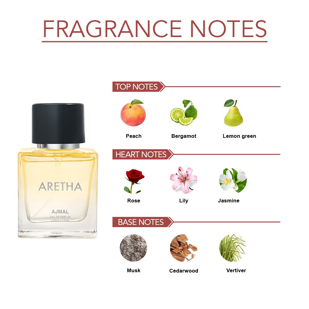 PEACH, BERGAMOT, PEAR,ROSE, LILY , JASMIN,MUSK, CEDAR WOOD, VERTIVER.