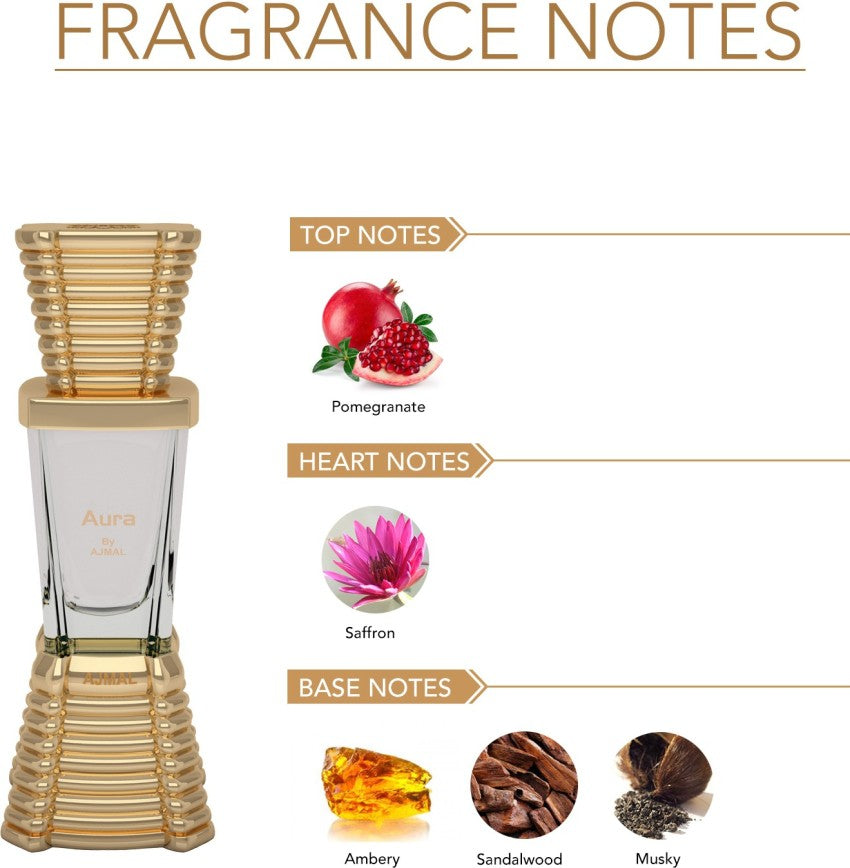 AURA CP: A fragrance of pure sensuality,pure transparency,pure luminosity.Opens with a fruity note that is built with pomegranate,yuzu & frozen fruits.Floral heart note is followed by a musky,ambery & woody base note. JANNATULFIRDAUS CP: Staying true to its name, this heavely scent opens with a floral fresh top which suddenly twists in to a bloom of spices and settles warmly with amber and musk on base. Giving the wearer a different feel and experience at every shift of the note