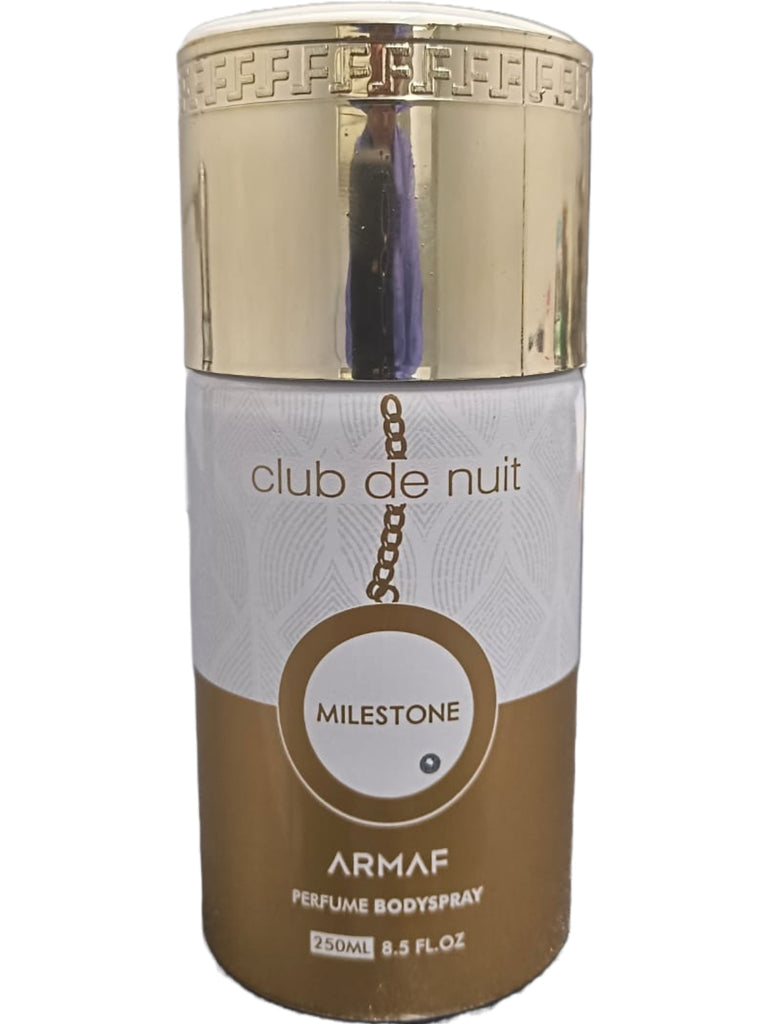 Club De Nuit Milestone by Armaf is a Woody Floral Musk fragrance for women. Top notes are Sea Notes, Red Fruits and Bergamot; middle notes are Violet, White Woods and Sandalwood; base notes are Ambroxan, Musk and Vetiver.