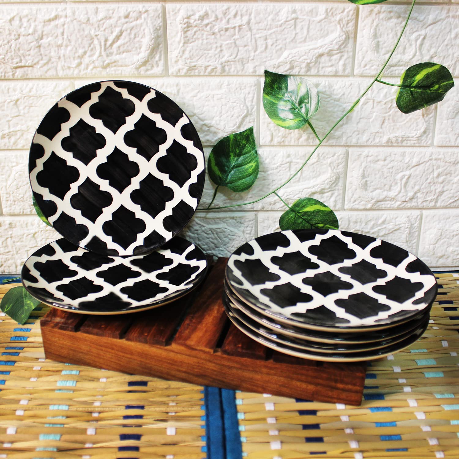 Black Moroccan Hand Painted Ceramic Quarter Plates Set Of 6 | Small Side Plates For Dinner & Snacks - 7 Inch, 6 Pieces, Microwave Safe