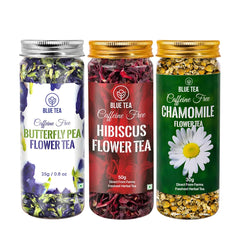 Blue Tea 3 In 1 Combo - Butterfly Pea Flower Tea + Hibiscus Tea+ Chamomile Tea, 105gm, 3.7 Ounce | Herbal Tea For Weight Loss, Skin Glow, Sleep - Non Bitter, Caffeine Free | Reusable Pet