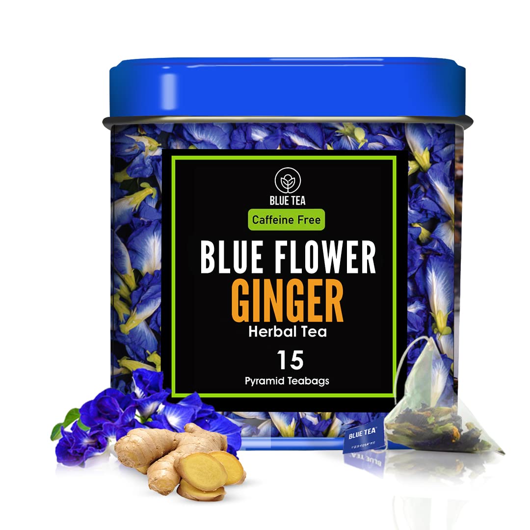 Blue Tea Blue Flower Ginger Herbal Tea - 15 Pyramid Tea Bags | Supports Overall Health & Well Being - Caffeine Free, Non-GMO, Antioxidant-Rich