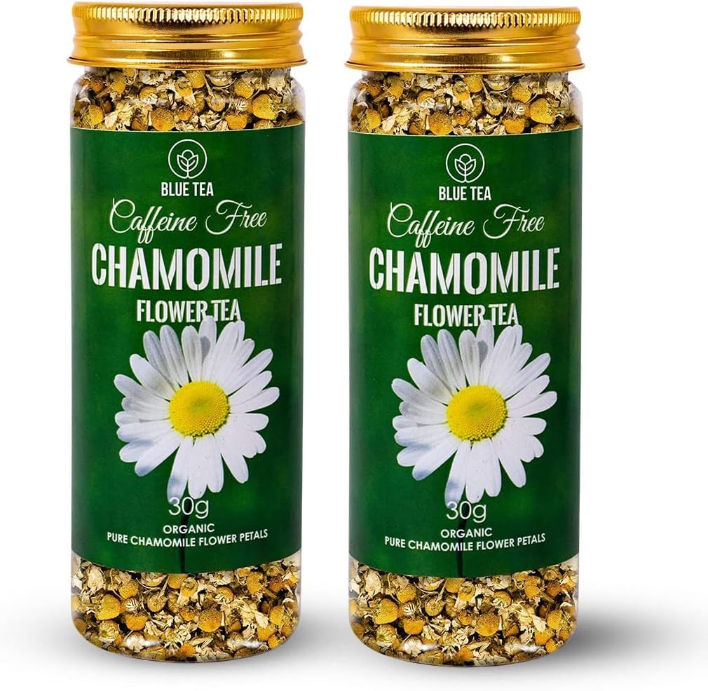 Blue Tea Caffeine Free Chamomile Flower Herbal Tea - Pack Of 2 X 30gm Reusable Pet Jar, 1.05 Ounce Each, 60+ Cups | Flower Based Caffeine Free, Non-Bitter, Non GMO - Improves Sleep & Relaxation