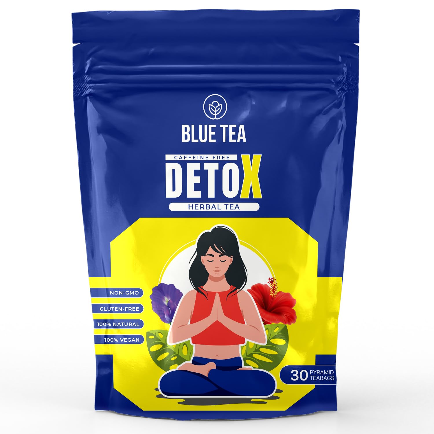 Blue Tea Caffeine Free Detox Herbal Tea - 30 Pyramid Tea Bags In Zip Lock Pack | Improves Digestion, Clear & Smooth Skin - Gluten Free, Non GMO