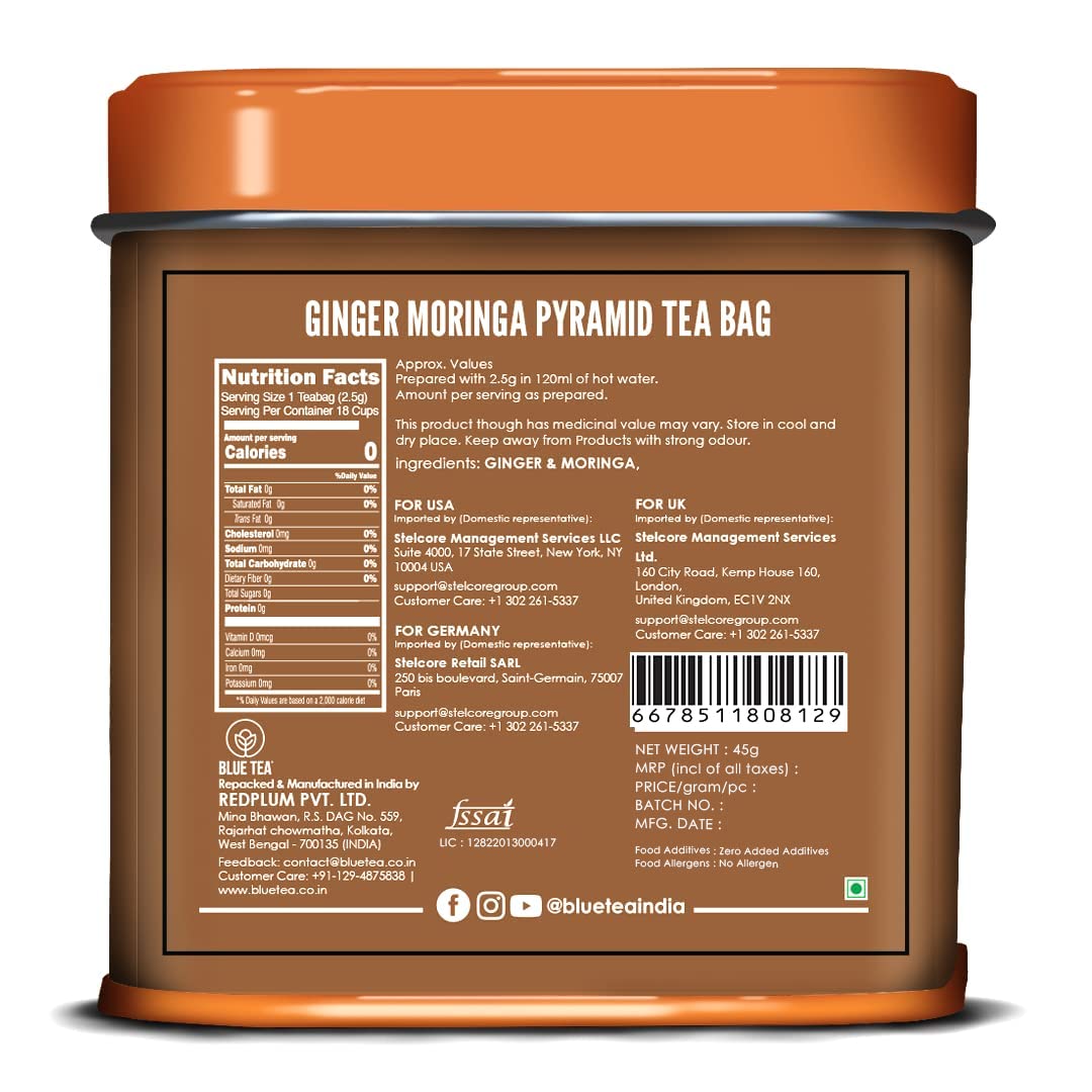 Blue Tea Caffeine Free Ginger Moringa Herbal Tea - 18 Pyramid Tea Bags In Tin Pack | Enhances Immune System - Gluten Free, Non-GMO