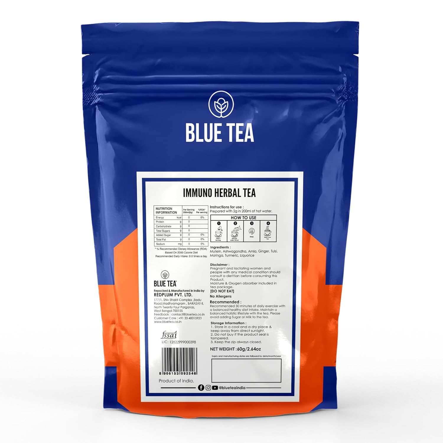 Blue Tea Caffeine Free Immuno Herbal Tea - 30 Pyramid Tea Bags In Zip Lock Pack | Immunity Booster - Gluten Free, Non-GMO, Zero Sugar, 100% Vegan