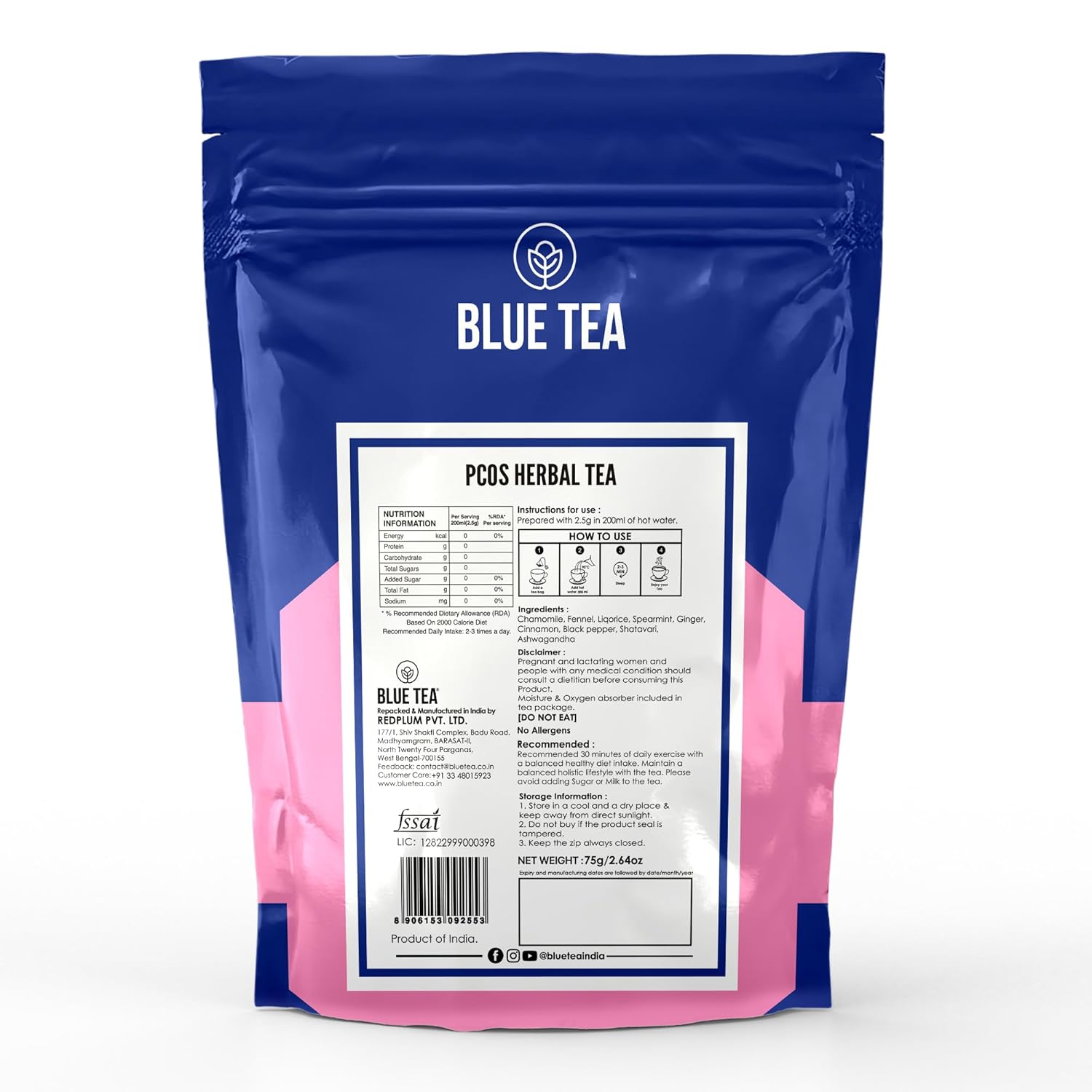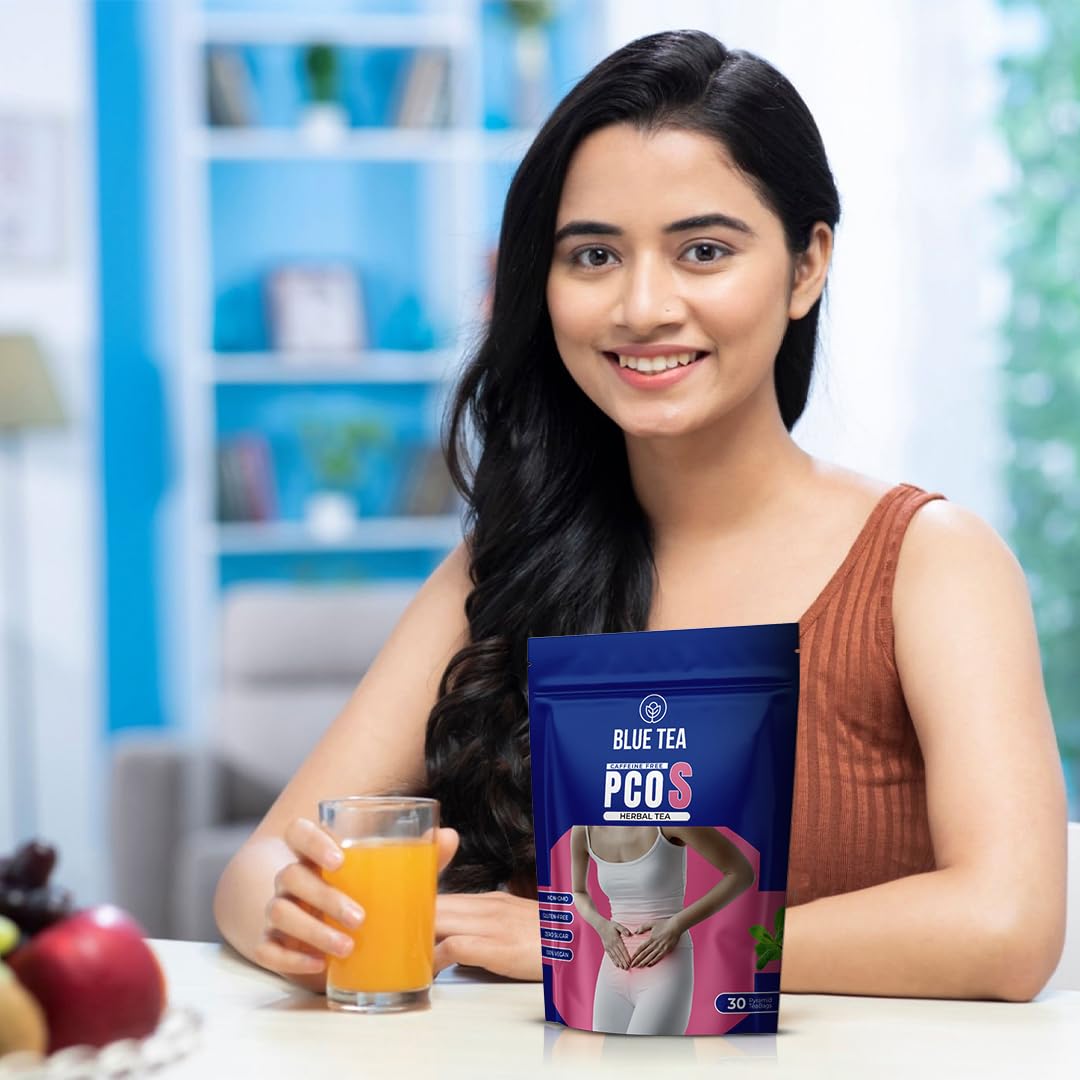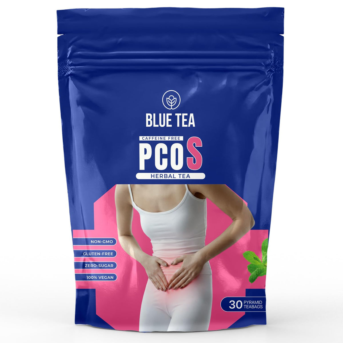 Blue Tea Caffeine Free PCOS Herbal Tea - 30 Pyramid Tea Bags In Zip Lock Pack | Pain Relief, Helps Menstrual Support, Cycle Regulation - Gluten Free, Non-GMO, Zero Sugar, 100% Vegan