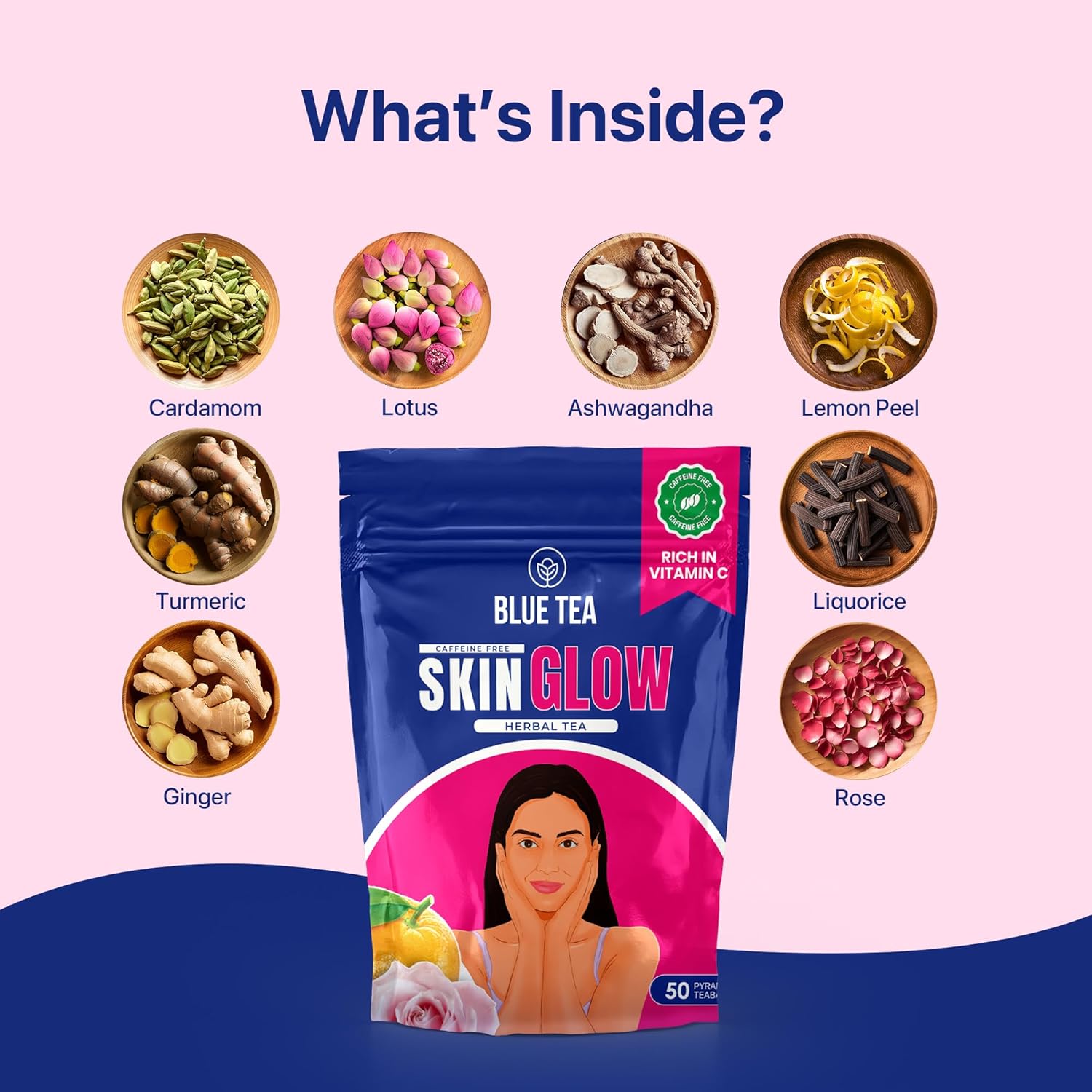 Blue Tea Caffeine Free Skin Glow Herbal Tea - 50 Pyramid Tea Bags In Zip Lock Pack | Antioxidants Support, Rich In Vitamin C - Gluten Free