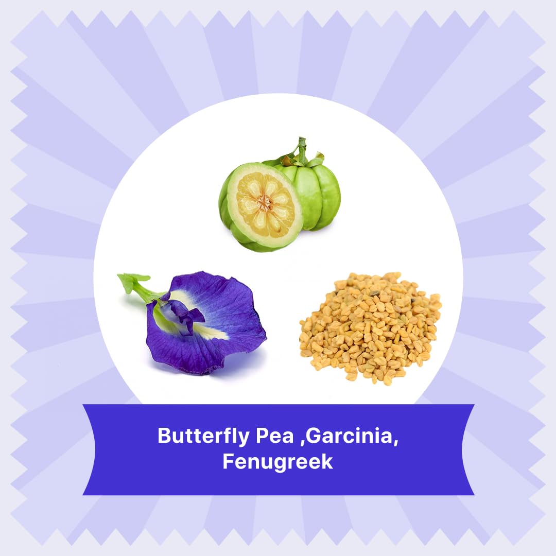 MAINTAIN A FLAT TUMMY: A unique combination of butterfly pea, garcinia, and fenugreek designed to help reduce tummy fat and improve metabolism.