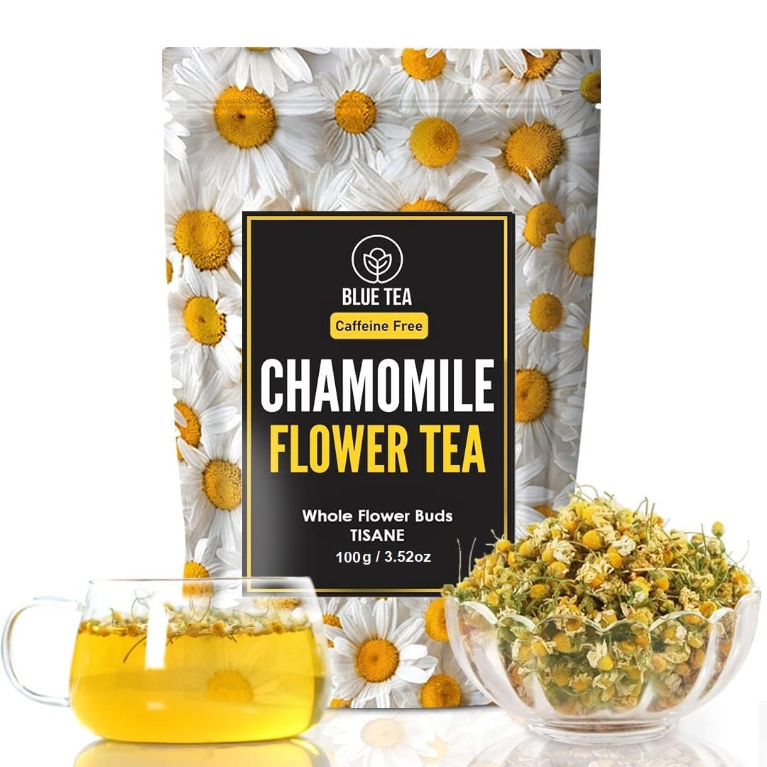 Blue Tea Chamomile Flower Tea - 100gm Zipper Pack, 3.5 Ounce, 100 Cups | Whole Flower Buds Tisane For Sleep & Relaxation - Caffeine Free, Non-Bitter, Non-GMO