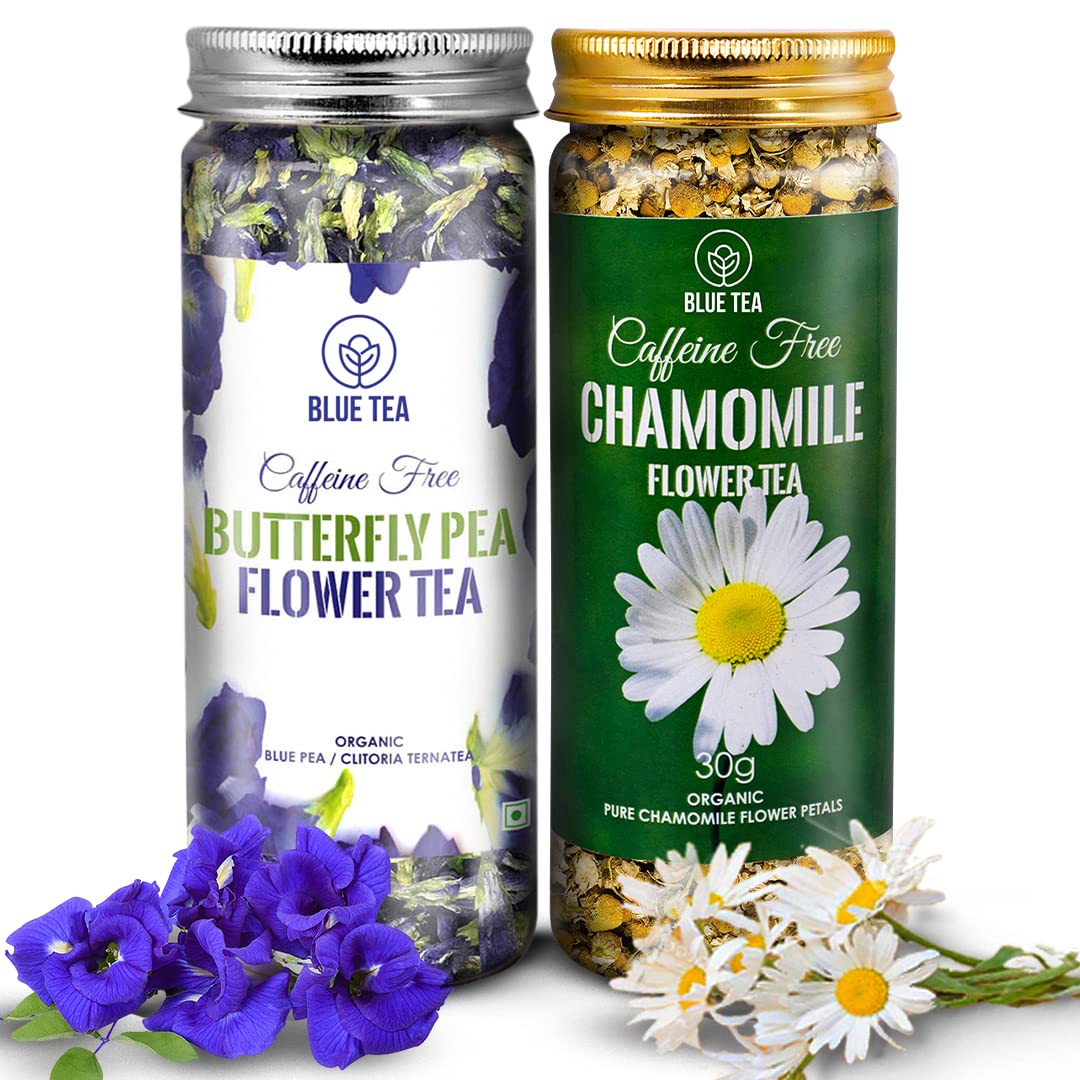 Blue Tea Combo Pack Of 2 - Butterfly Pea Flower Tea 25gm, 0.8 Ounce + Chamomile Flower Tea 30gm, 1.05 Ounce | Antioxidant Rich - Caffeine Free, Gluten Free, Non GMO | Pet Jar Packaging