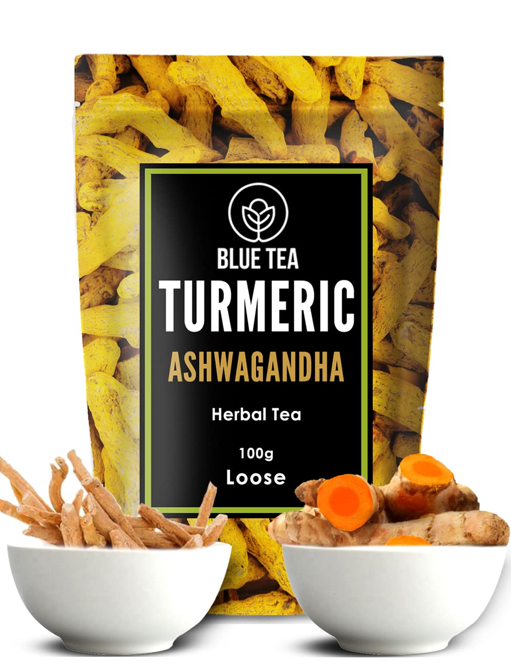 Blue Tea Turmeric Ashwagandha Herbal Tea - 100gm Zipper Pack, 3.5 Ounce, 100 Cups | Supports Immune System & Overall Health - Caffeine Free, Non-GMO, Gluten Free