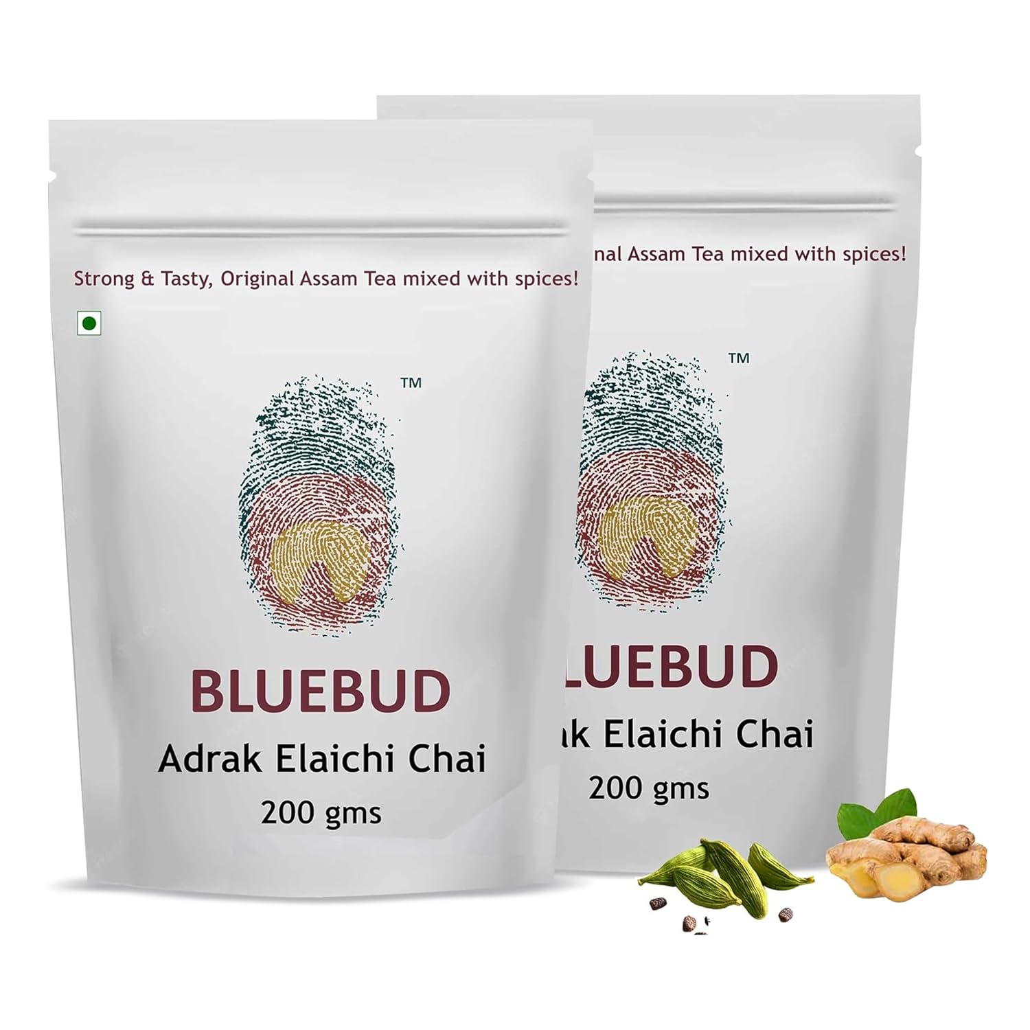 Bluebud Adrak Elaichi Chai Patti Pack Of 2 X 200gm, 7.05 Ounce Each - 200 Cups | Premium Assam CTC Tea Granules With 100% Natural Spices - Ginger Cardamom Tea Hand Blended Teas | Homemade Recipe