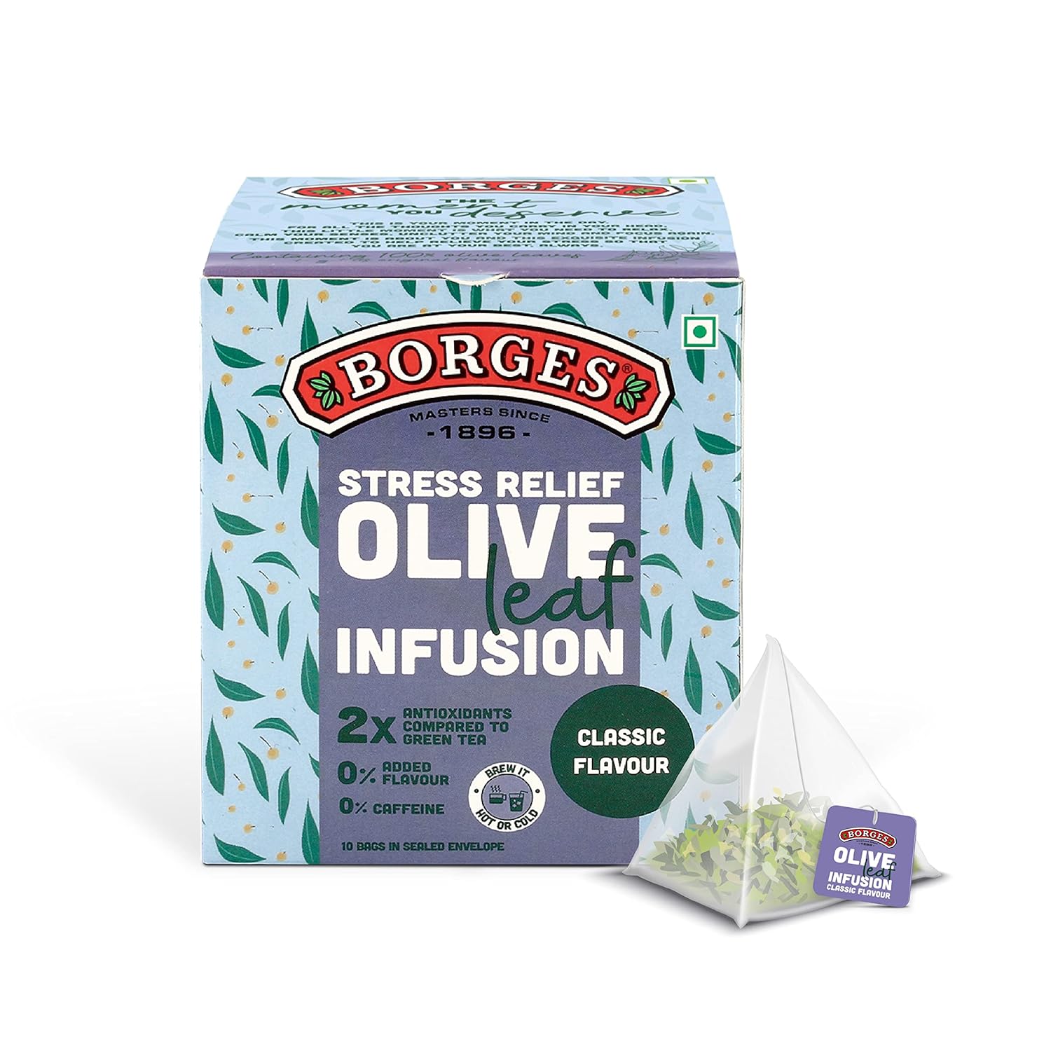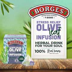 Borges Stress Relief Olive Leaf Infusion Classic Flavor Tea - 10 Bags In Sealed Envelope | 2X Antioxidants Than Green Tea - Caffeine Free, No Added Flavor