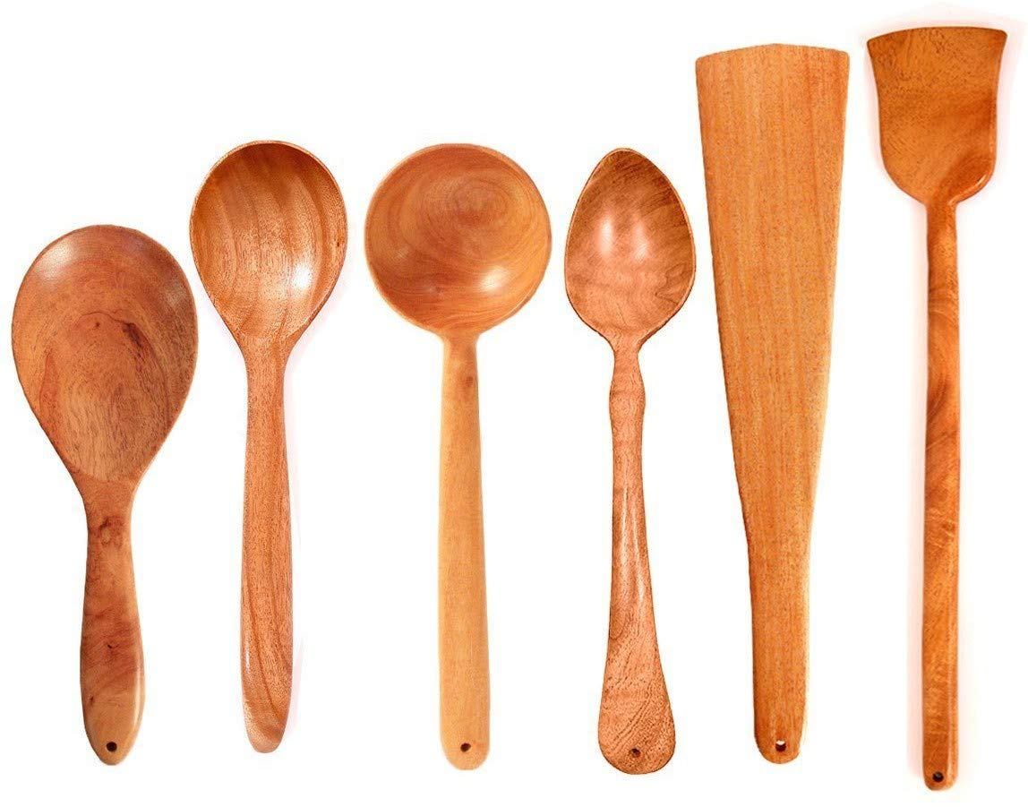 Brown Neem Wood Compact Flip, Spatula, Ladle For Cooking Dosa, Roti, Chapati | Kitchen Tools | No Harmful Polish | Naturally Non-stick | Handmade Set Of 6, 23 Cm