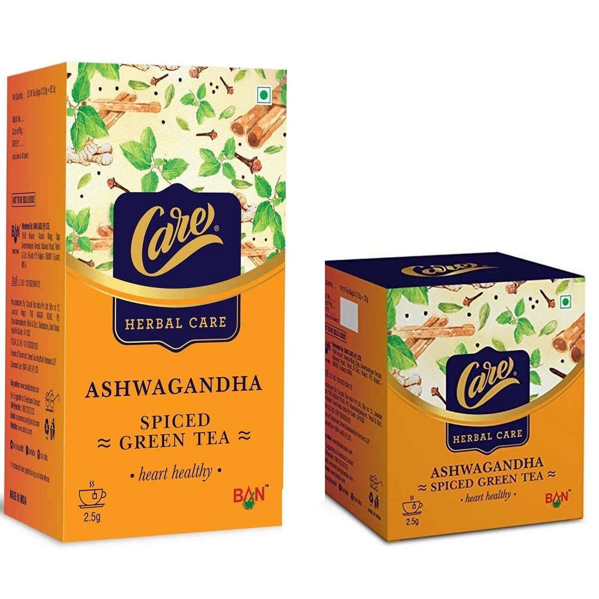 Care Ashwagandha Spiced Herbal Care Green Tea - 35 Sachets, 2 Packs | Organic Desi Kahwa With Tulsi, Ginger, Cinnamon - Ayurvedic Indian Kadha For Detoxification | Whole Loose Leaves Blend