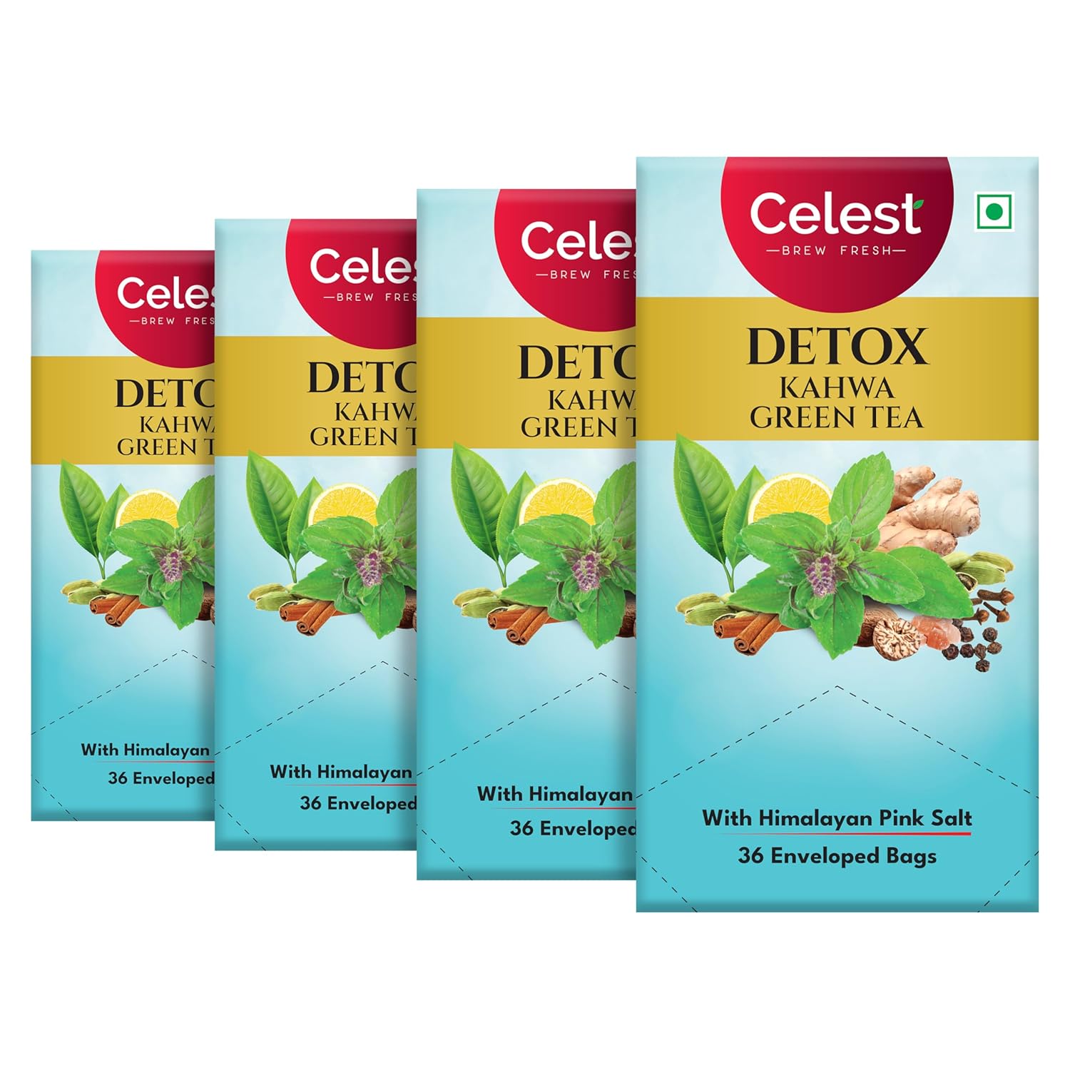 Celest Detox Kahwa Green Tea With Himalayan Pink Salt - Pack Of 4 X 36 Enveloped Tea Bags | Perfect Weight Loss Green Tea With Herbal Goodness - Mixed Herbs & Spices