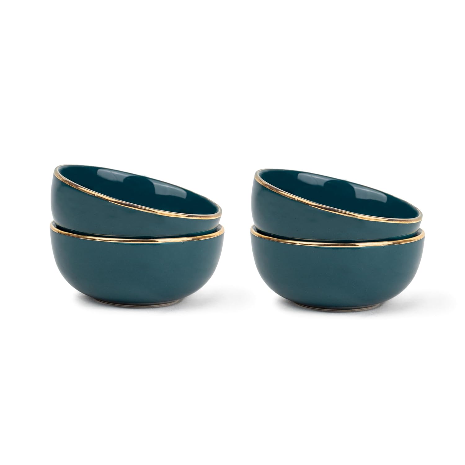 Ceramic Bowl Set Of 4 Pieces For Snacks - 330ml Each, Teal Gold | Maggie Bowl, Noodle Bowl With Glossy Finish | Premium Stoneware | Microwave Safe & Dishwasher Safe
