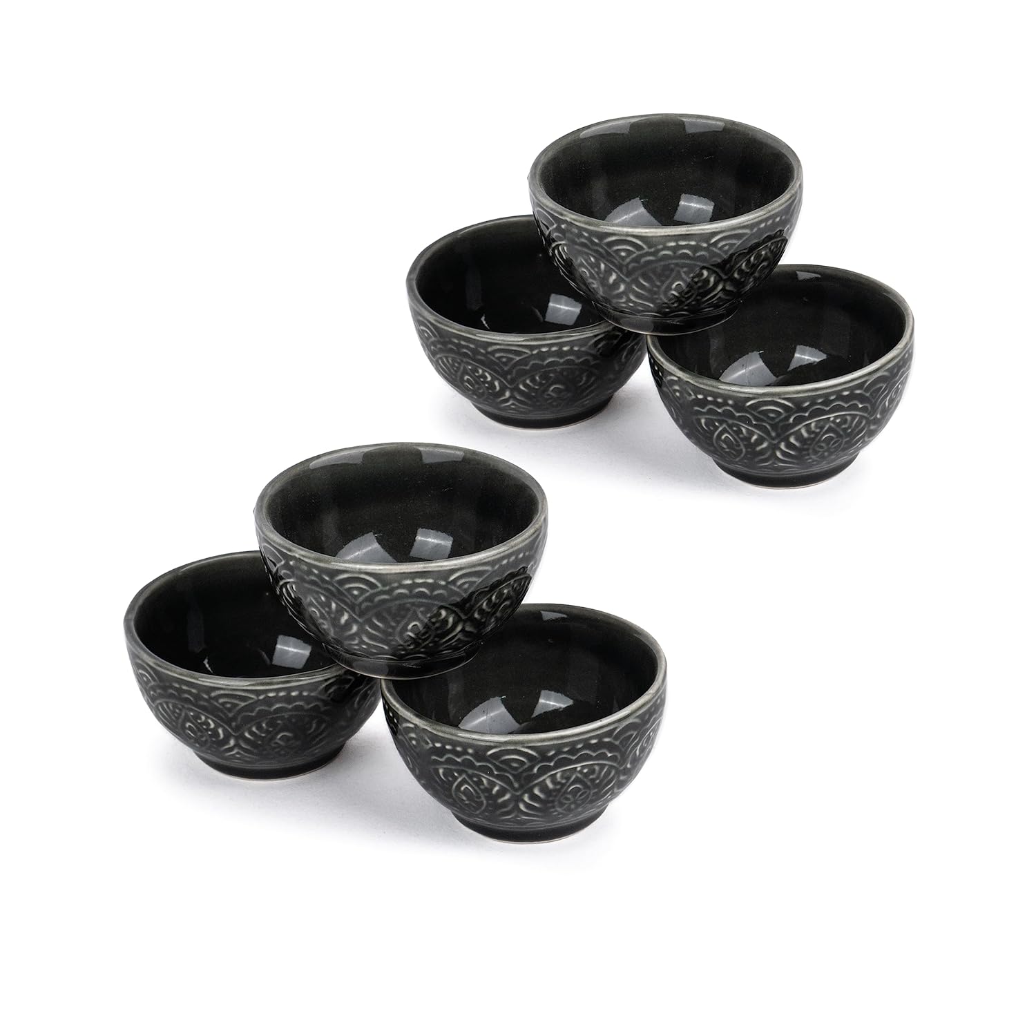 Ceramic Carving Veg Bowls Set Of 6 For Dinner - 160ml Each, Black Carving | Katori Set | Ceramic Bowls With Glossy Finish | Dessert Bowl Set | Ice Cream Bowls
