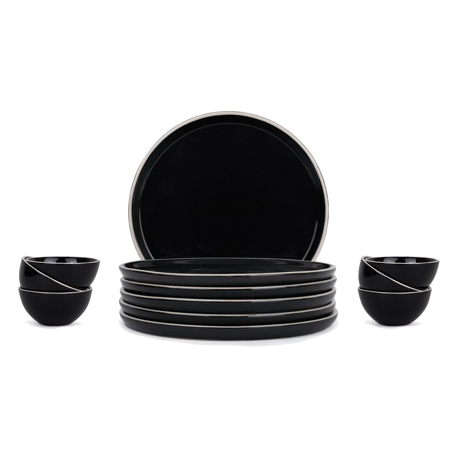 Ceramic Dinner Set Of 12 Pcs, Black Rim | Crockery Set For Dining Table | Dining Sets Crockery Items | Glossy Finish Premium Stoneware | 6 Dinner Plates + 6 Veg Small Bowls, 180ml Each