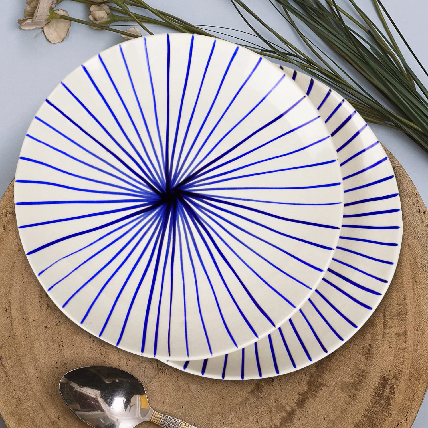 Ceramic Striped Dinner Serving Plates Set Of 2 - White & Blue, Diameter: 10 Inches | Full Plates - Blue Kasa Line
