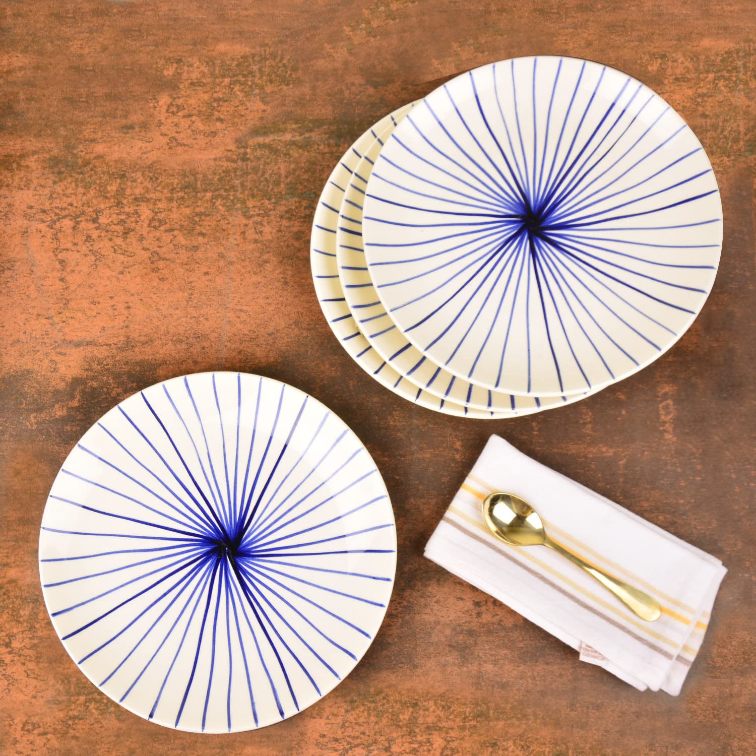 Ceramic Striped Dinner Serving Plates Set Of 4 - White & Blue, Diameter: 10 Inches | Full Plates - Blue Kasa Line