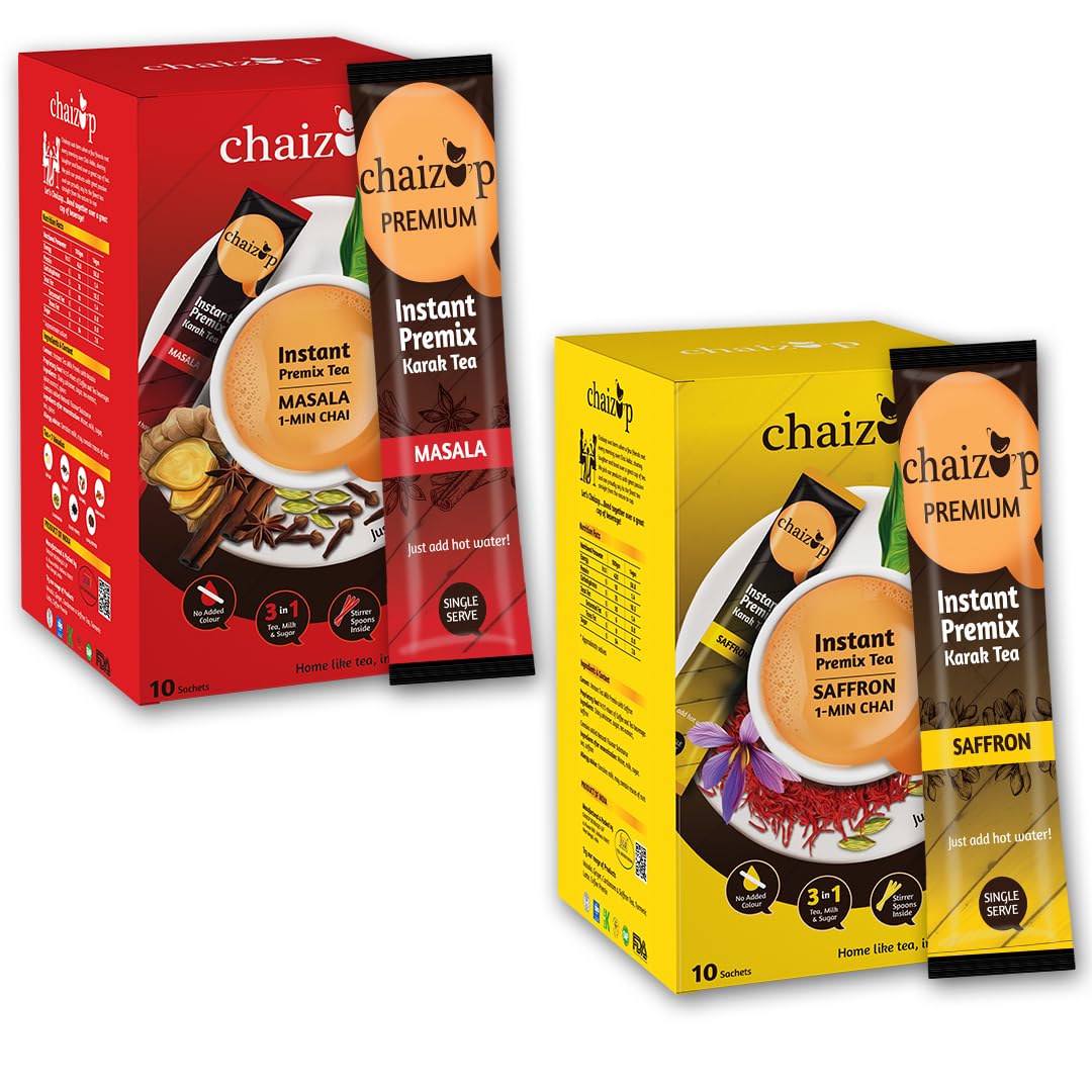 Chaizup Premium 1 Min Instant Assorted Tea Pack - 20 Sachets | Saffron + Masala Flavors - 2 Packs, 10 Flavors Each | Just Add Hot Water - Low Caffeine