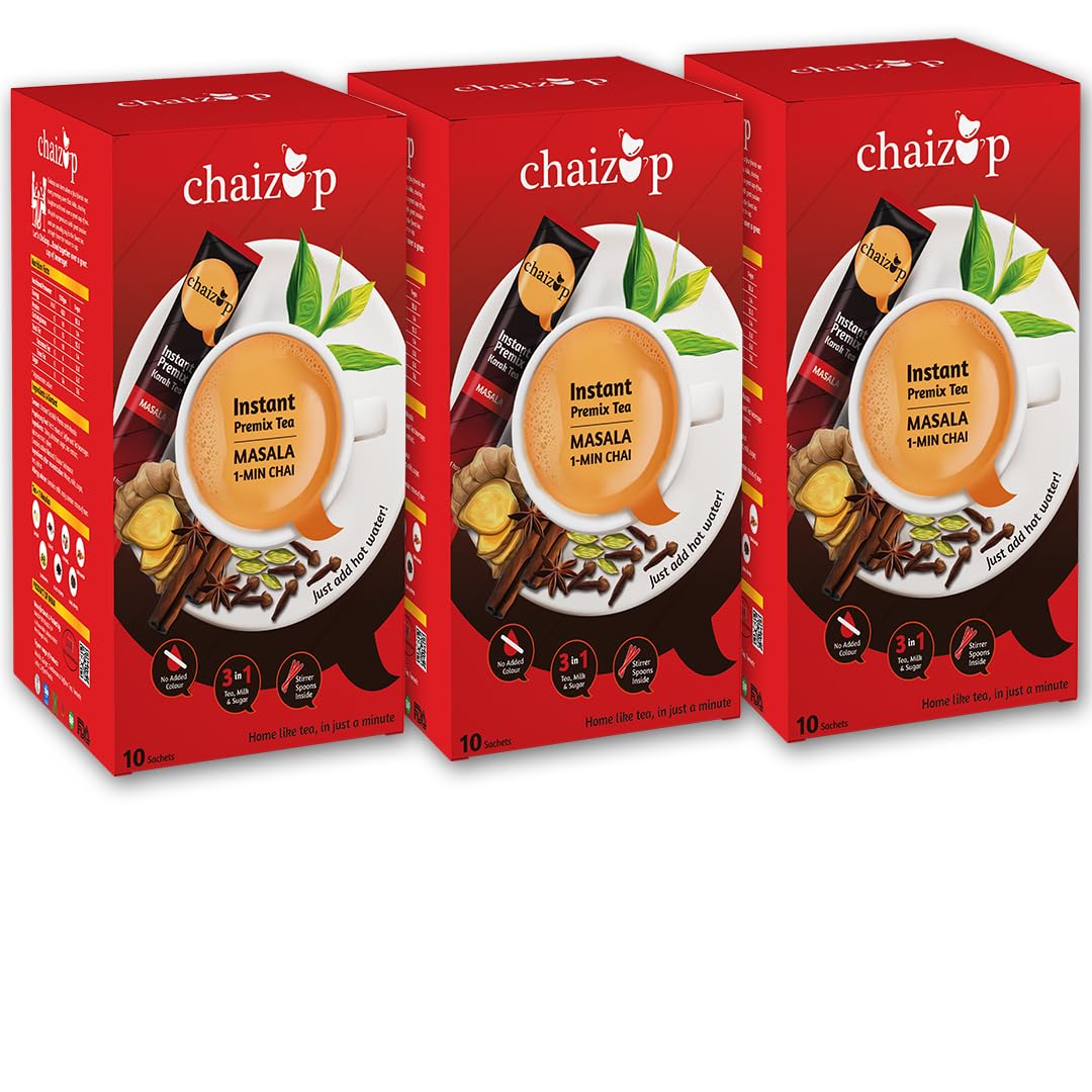 Chaizup Premium 1 Min Instant Masala Tea Premix - Pack Of 3 X 140gm, 4.9 Ounce Each, 30 Sachets | Just Add Hot Water - Assam Masala Chai Powder | Low Caffeine, No Added Color - Home Like Tea