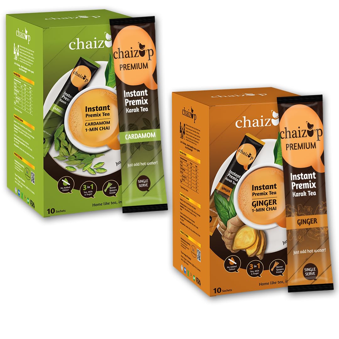 Chaizup Premium 1 Min Instant Premix Assorted Tea Pack - 20 Sachets | Cardamom + Ginger Flavors - 2 Packs, 10 Flavors Each | Low Caffeine Home Like Tea