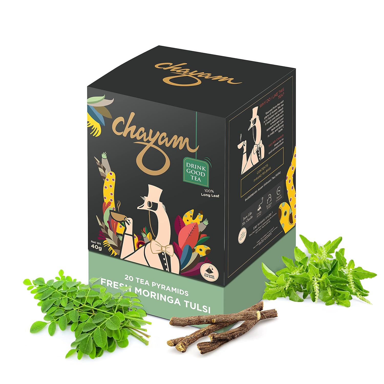 Chayam Fresh Moringa Tulsi Green Tea - 20 Pyramid Tea Bags | 100% Natural Whole Leaf Tea - Improves Digestion, Boosts Immunity | Low Caffeine, Gluten Free
