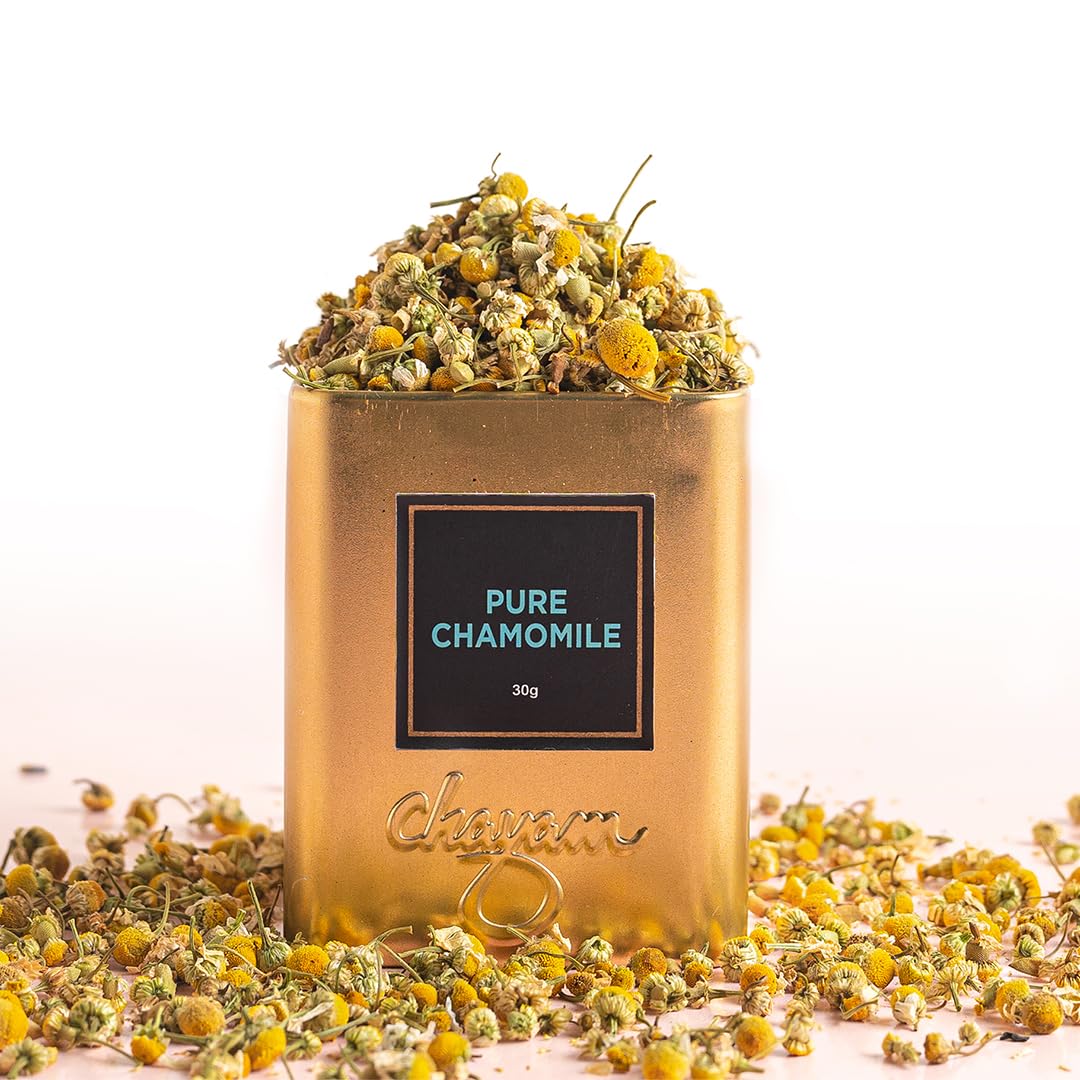 Chayam Pure Chamomile Tea - 30gm Tin Caddy, 1.05 Ounce | Sleep & Stress Relief, Calming Bedtime Herbal Tea - Pure Whole Chamomile Flowers | Caffeine Free