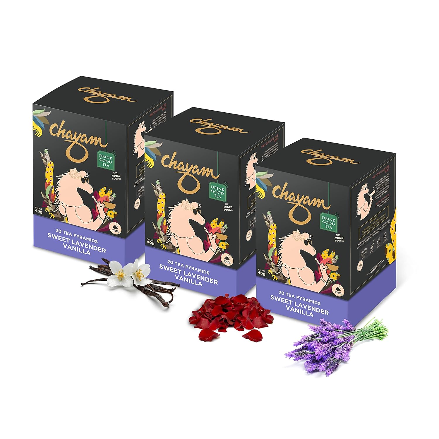 Chayam Sweet Lavender Vanilla Tea - Pack Of 3 X 20 Pyramid Tea Bags | Blended With Lavender, Roasted Chicory, Vanilla & Rose Petals - Make Iced Or Hot Tea | Low Caffeine, Gluten Free, No Added Sugar