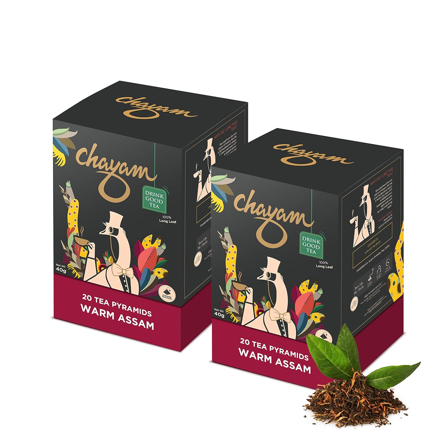 Chayam Warm Assam Tea - Pack Of 2 X 20 Pyramid Tea Bags | Premium Orthodox Whole Leaf Black Tea - Make Iced Or Hot Tea | Low Caffeine, Gluten Free, High Antioxidants