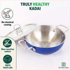Coloured Stainless Steel Kadai With Steel Lid | Blue, Large, 28.8cm, 11.3 Inch, 4.5 Liters, 1.2 Kg | Induction Friendly | Nonstick 3-layer Bottom, 100% Toxin-free, No Chemical Coating